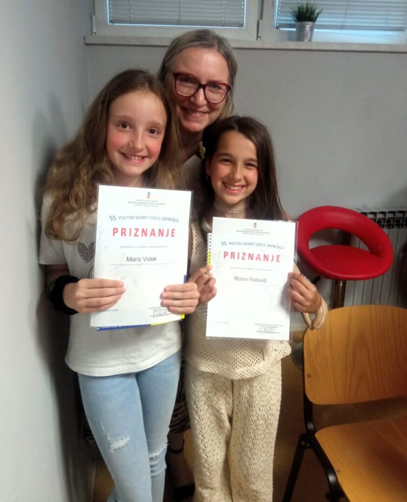 U Gradskoj knjižnici Ante Kovačića u Zaprešiću jučer je održan je 55. Poetski susret djece Zaprešića. Osnovnoškolci iz Zaprešića i okolice natjecali su se u pisanju poezije na standardnom hrvatskom jeziku i kajkavskom narječju. Stručni žiri odabrao je 20 najboljih radova, a među njima su radovi naših četvrtašica. Radovi Maris Videk i Robin Rolović objavljeni su u zborniku, a učenice 4. b i njihova mentorica učiteljica Kristina Posarić primili su priznanja. Na svečanosti su i same kazivale svoju poeziju. Bravo!