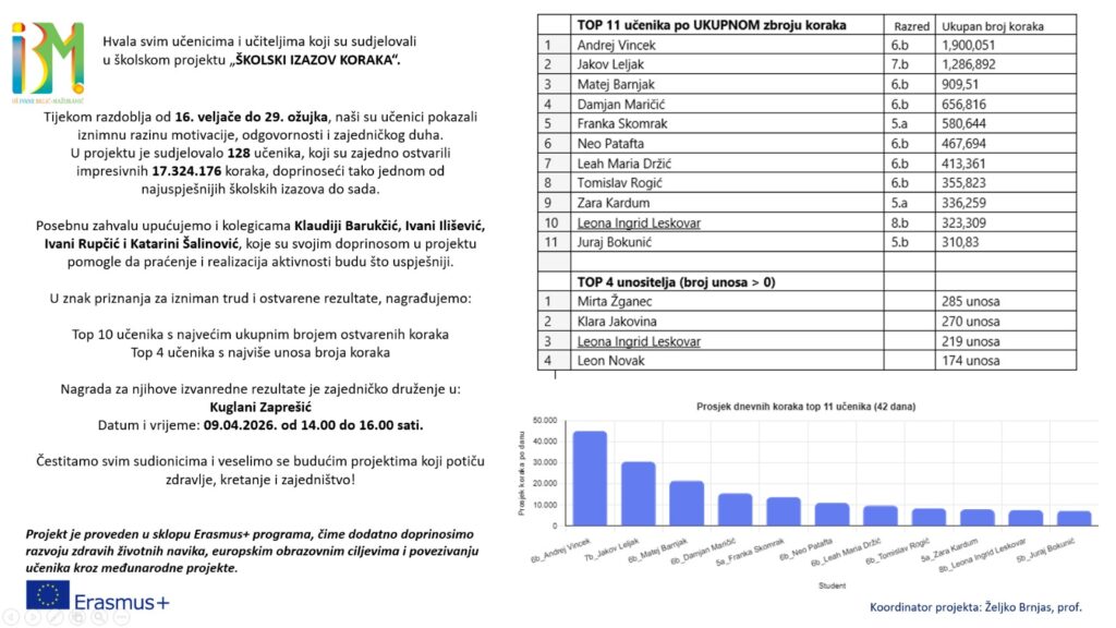 Stigli su finalni rezultati našeg školskog izazova koraka. Od 16. veljače do 29. ožujka, 128 učenika škole napravilo je nevjerojatnih 17.324.176 koraka.